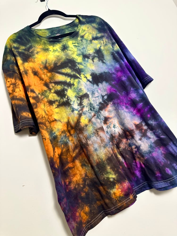 THIS PIECE OF WEARABLE ART IS READY TO SHIP AND A SIZE 2XL. SHE IS HAND DYED BY ME & INSPIRED BY SPOOKY GRAVEYARD SCENES UNDER A BIG FALL MOON. MY TEESHIRTS ARE 100% SUPER SOFT COTTON & CLASSIC UNISEX SIZING. PLEASE CONSULT SIZE CHART IN THE PHOTOS.