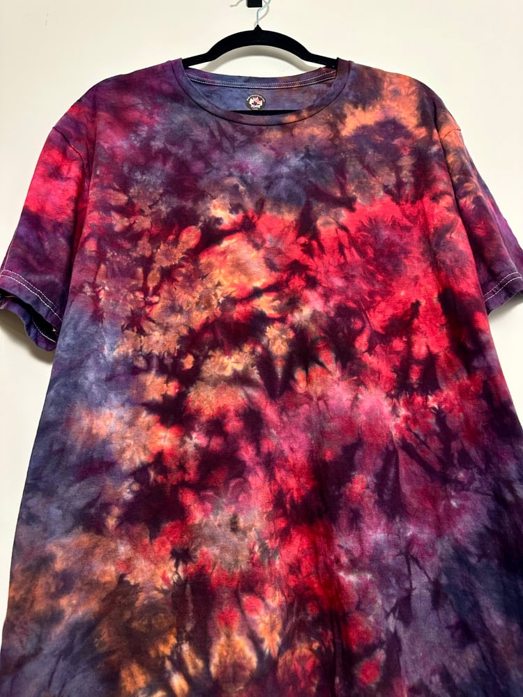 THIS PIECE OF WEARABLE ART IS READY TO SHIP AND A SIZE LARGE. SHE IS HAND DYED BY ME & INSPIRED BY MY ORIGINAL BLOOD MOON COLORWAY, HEAVILY INSPIRED BY FALL MOON PHASES & THE EERIE NIGHT SKY. MY TEESHIRTS ARE 100% SUPER SOFT COTTON & CLASSIC UNISEX SIZING. PLEASE CONSULT SIZE CHART IN THE PHOTOS.