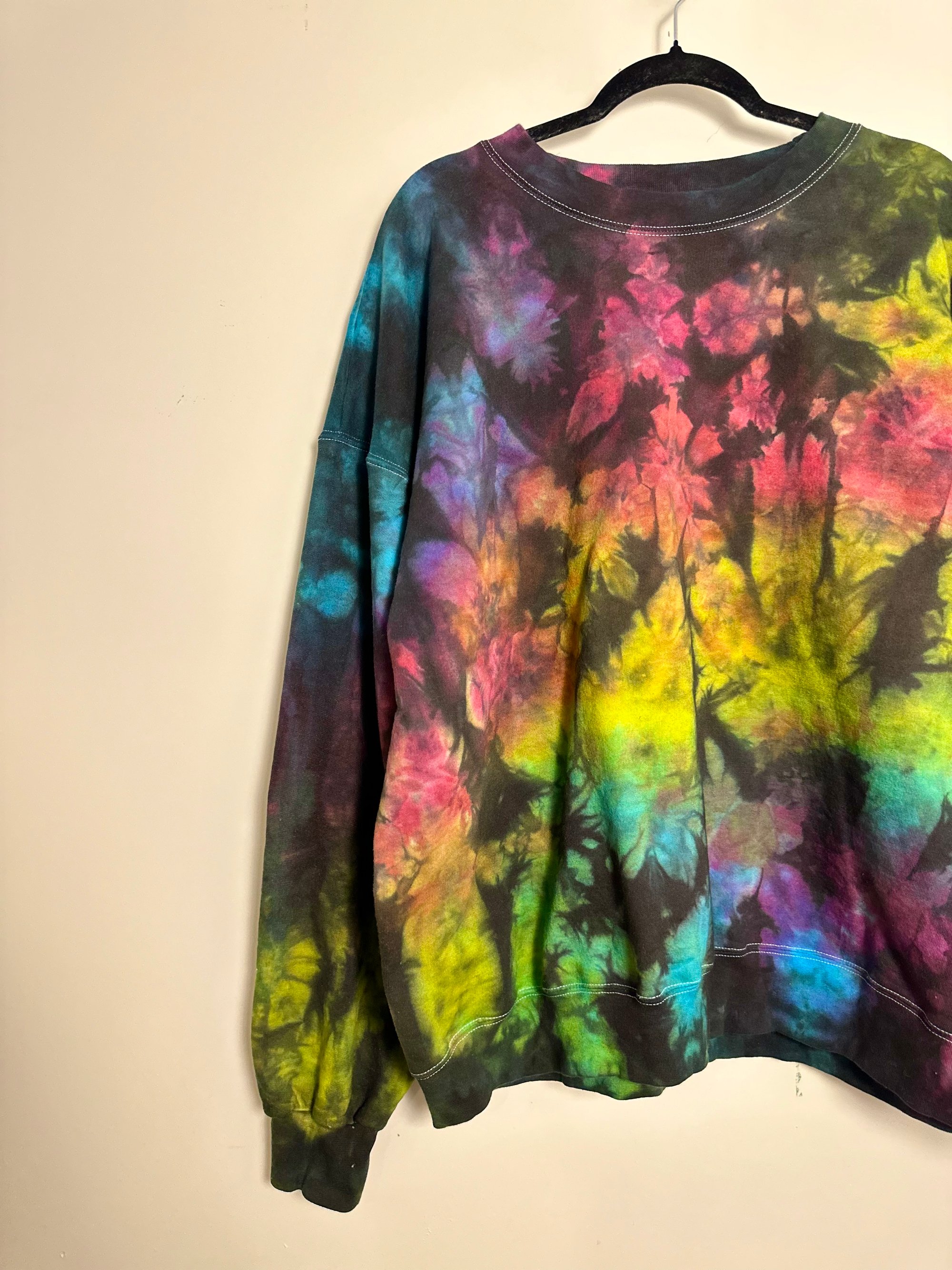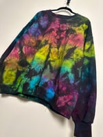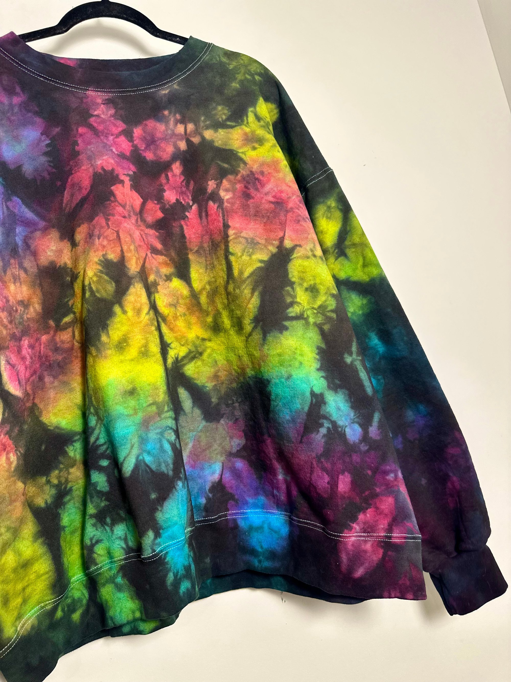 THIS PIECE OF WEARABLE ART IS READY TO SHIP AND A SIZE 2XL. SHE IS HAND DYED BY ME & INSPIRED BY MY ORIGINAL ENIGMA COLORWAY. MY CREWNECK SWEATSHIRTS ARE 100% COTTON & CLASSIC UNISEX SIZING. PLEASE CONSULT SIZE CHART IN THE PHOTOS.