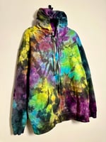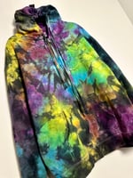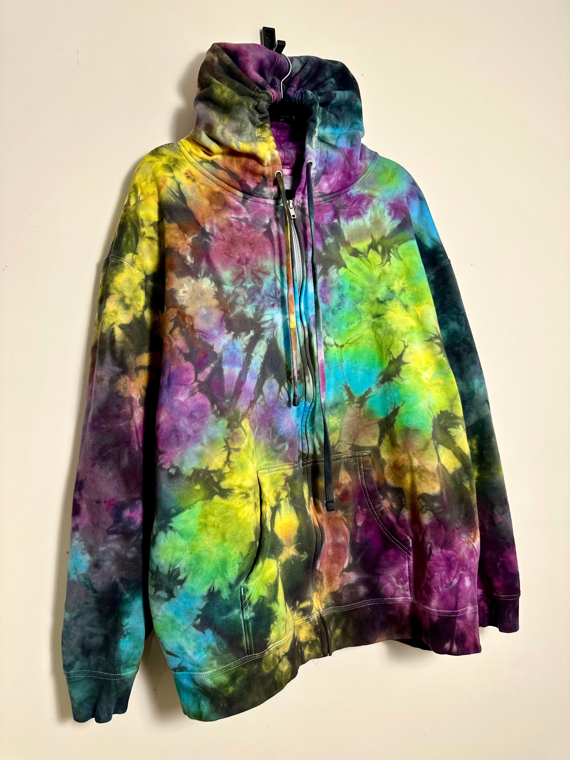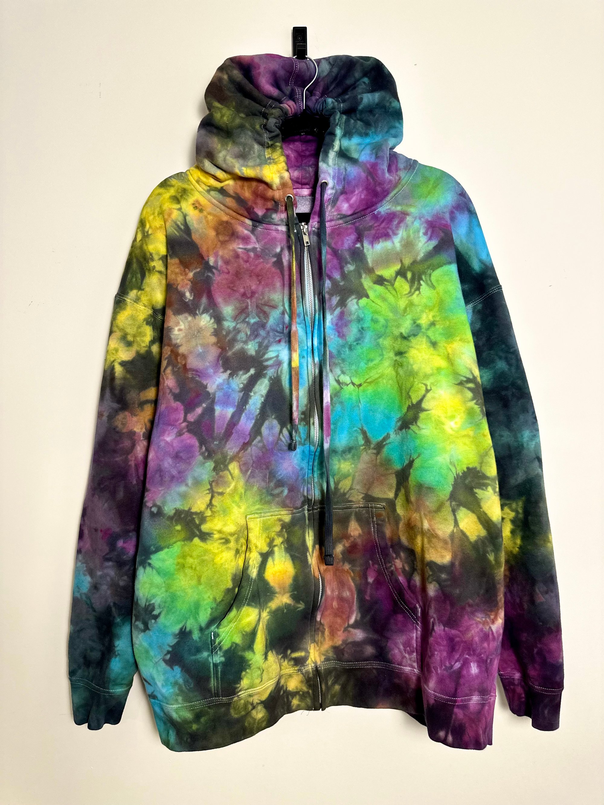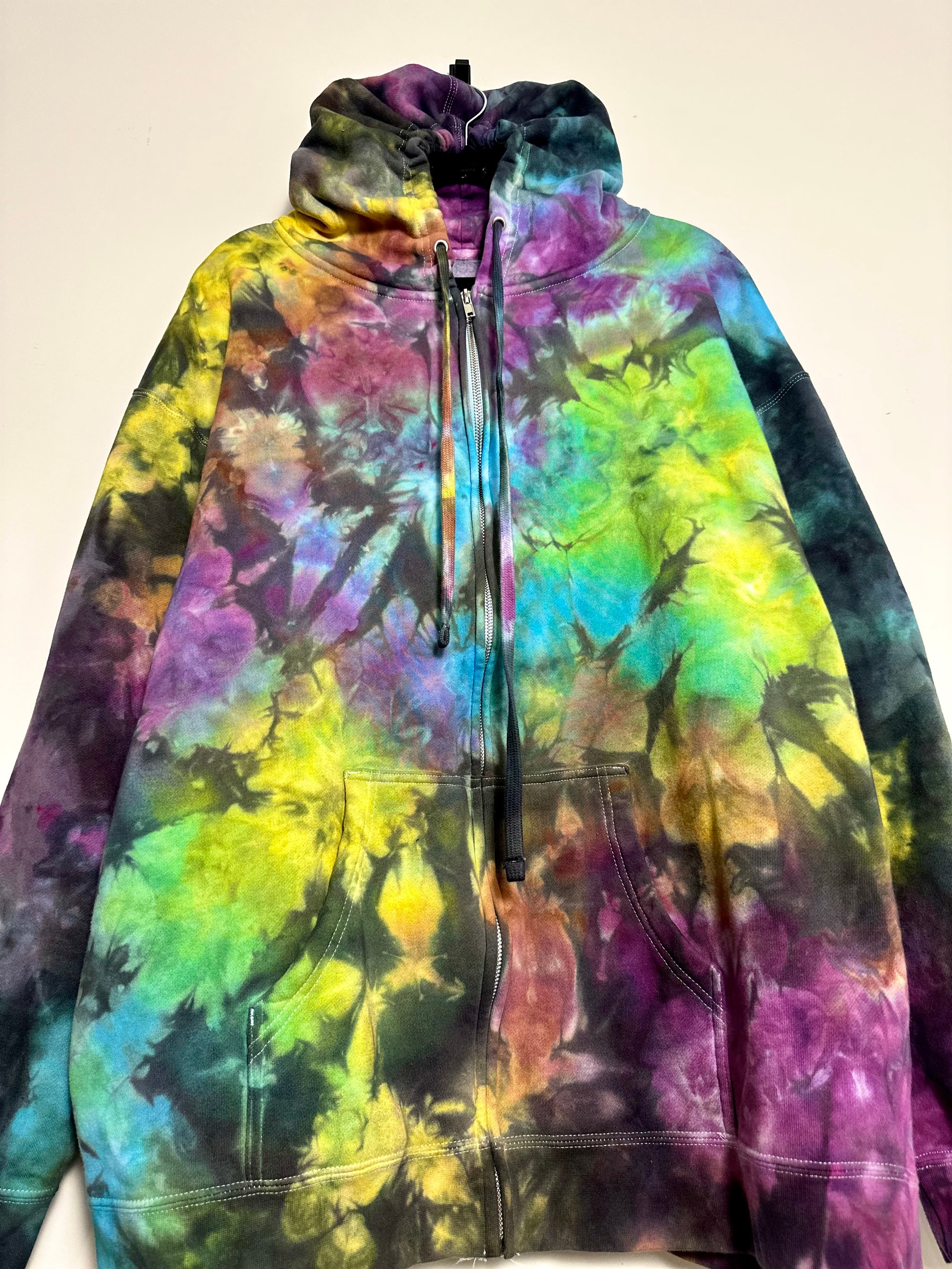 THIS PIECE OF WEARABLE ART IS READY TO SHIP AND A SIZE 2XL. SHE IS HAND DYED BY ME & INSPIRED BY MY ORIGINAL DAYDREAM COLORWAY. MY FULL ZIP HOODIES ARE 100% COTTON & CLASSIC UNISEX SIZING. THEY FEATURE A FULL METAL ZIPPER & 2 POCKETS. PLEASE CONSULT SIZE CHART IN THE PHOTOS.