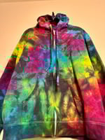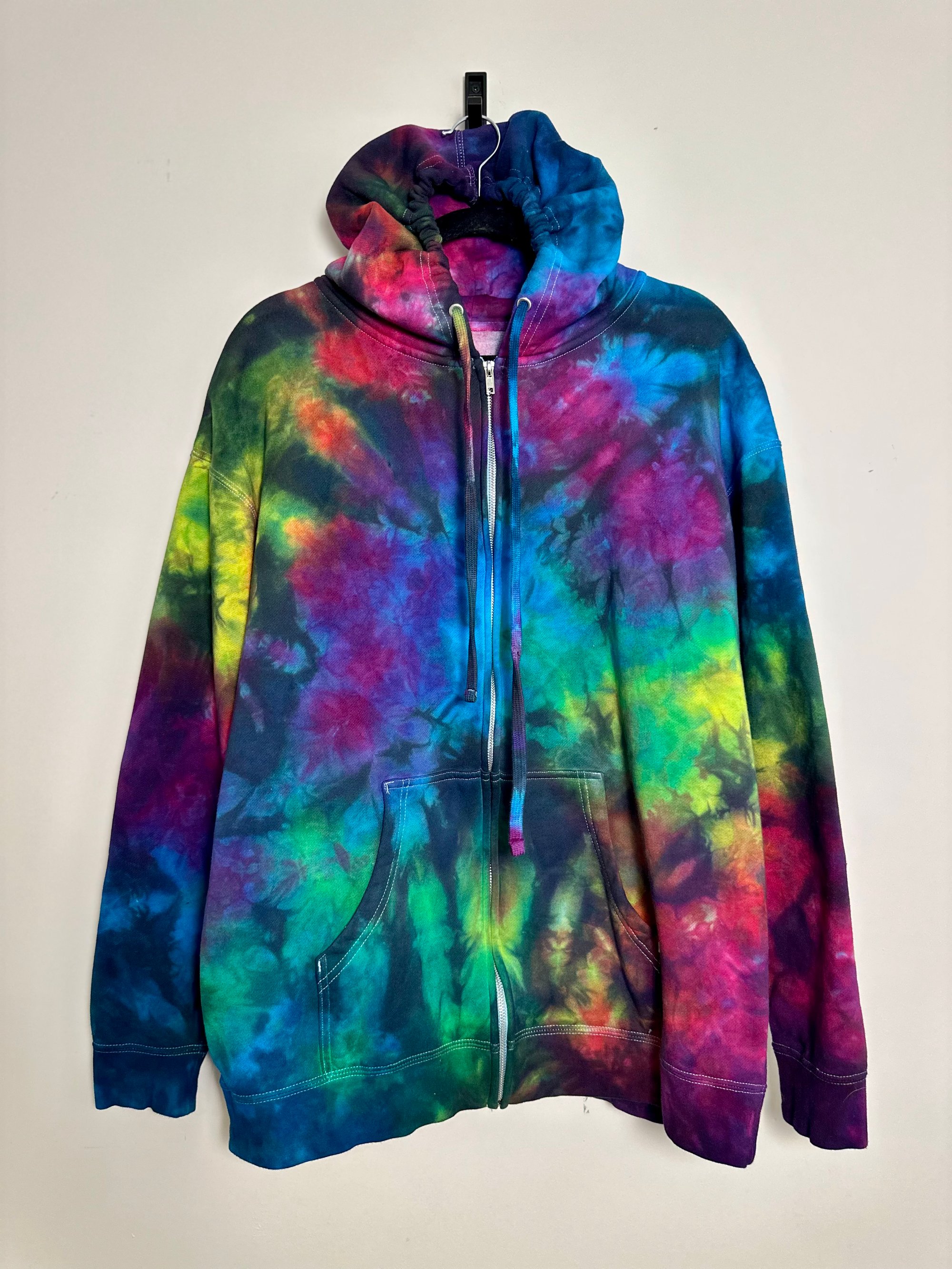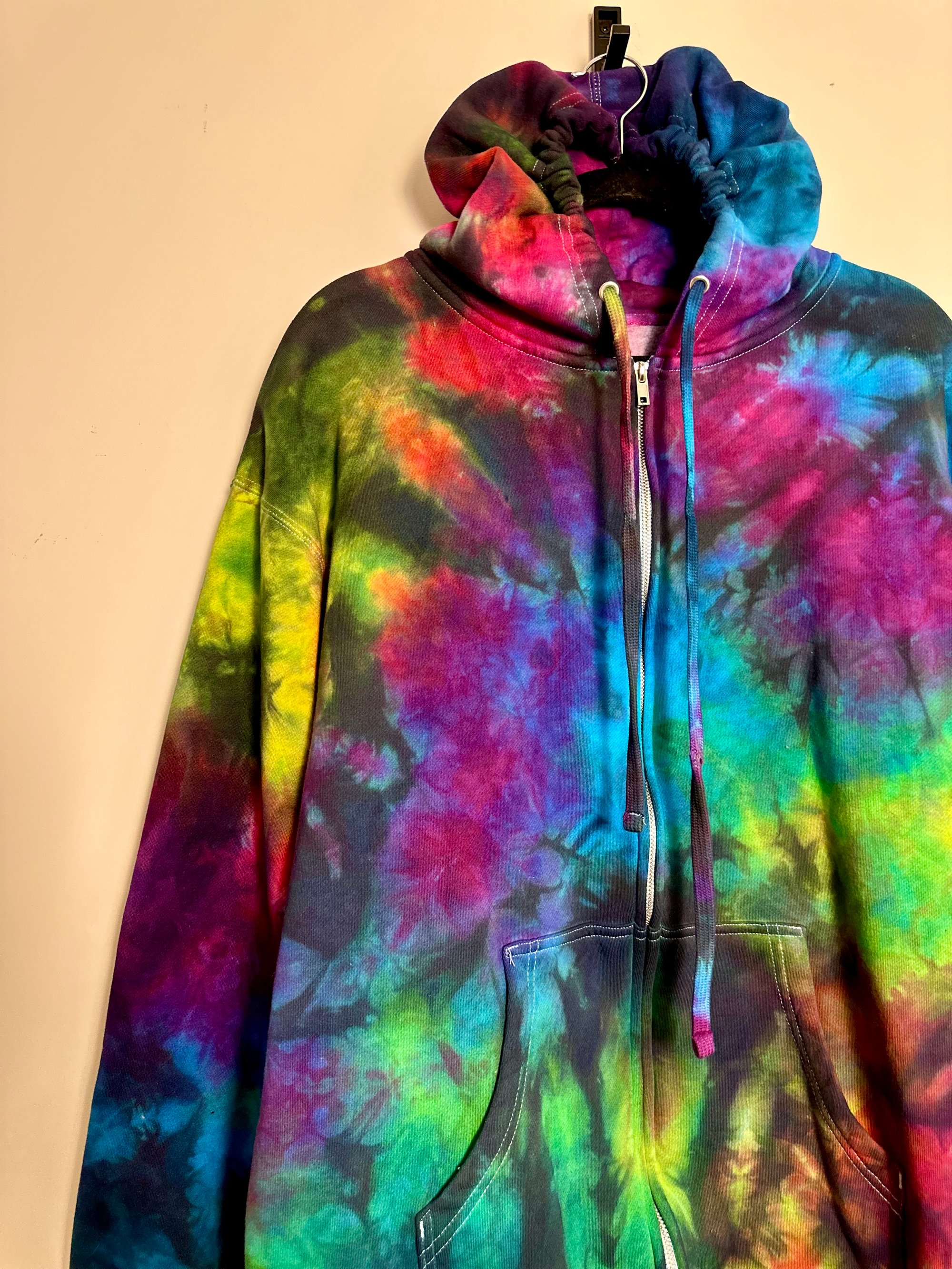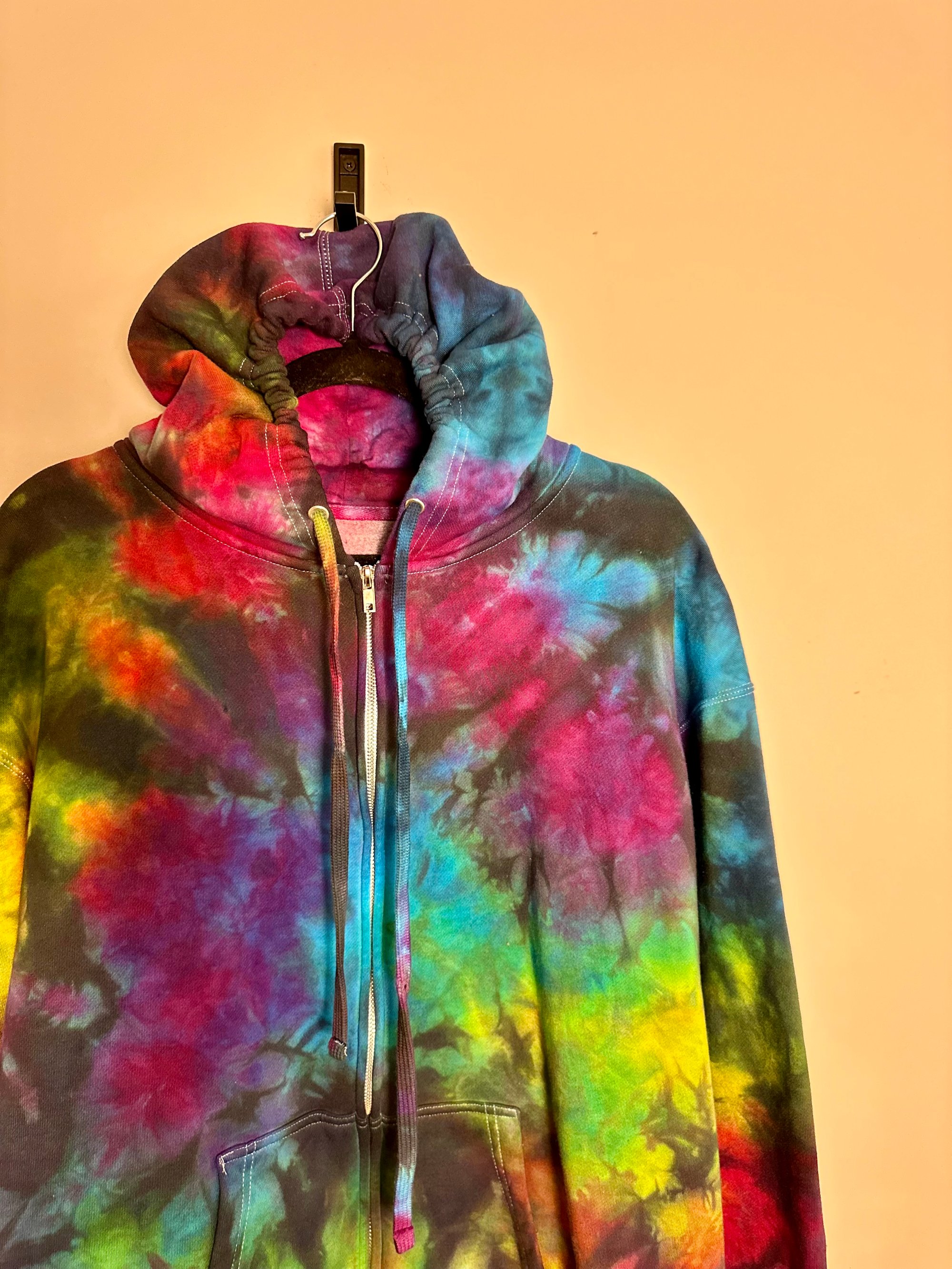 THIS PIECE OF WEARABLE ART IS READY TO SHIP AND A SIZE MEDIUM. SHE IS HAND DYED BY ME & INSPIRED BY MY ORIGINAL LAST NIGHT COLORWAY. MY FULL ZIP HOODIES ARE 100% COTTON & CLASSIC UNISEX SIZING. THEY FEATURE A FULL METAL ZIPPER & 2 POCKETS. PLEASE CONSULT SIZE CHART IN THE PHOTOS.